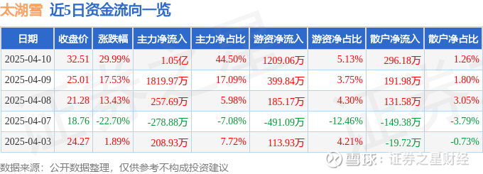 证券之星消息,太湖雪4月10日涨停收盘,收盘价32.51元。该股于9点47分涨停,1次打开涨停,截止收盘封单资金为5042.8万元,占其流通市值6.47%。