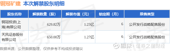 证券之星消息,根据市场公开信息整理,铜冠矿建(920019)于4月14日将有1279.82万股限售股份解禁,为公司公开发行战略配售股份,占公司总股本6.09%。(本次数据根据历史公告整理得出,实际情况以上市公司最新公告为准)本次解禁后,公司还有1.54亿股限售股份,占总股本73.43%。具体如下图所示: