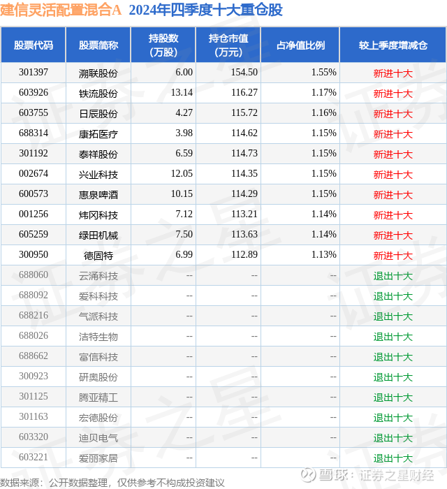 根据2024基金年报公募基金重仓股数据,重仓该股的公募基金共1家,其中持有数量最多的公募基金为建信基金的建信灵活配置混合A。建信灵活配置混合A目前规模为0.45亿元,最新净值1.249(4月15日),较上一交易日上涨0.6%,近一年上涨47.95%。该公募基金现任基金经理为叶乐天 郭志腾。叶乐天在任的基金产品包括:建信央视财经50指数(LOF),管理时间为2013年3月28日至今,期间收益率为194.21%;建信中证500指数增强A,管理时间为2014年1月27日至今,期间收益率为152.88%;建信精工制造指数增强,管理时间为2015年8月26日至今,期间收益率为69.59%;建信多因子量化股票,管理时间为2016年8月9日至今,期间收益率为33.41%。郭志腾在任的基金产品包括:建信沪深300红利ETF联接A,管理时间为2023年12月7日至今,期间收益率为23.14%;建信沪深300红利ETF,管理时间为2023年12月7日至今,期间收益率为23.16%。