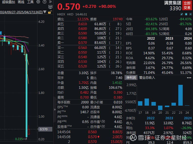 4月17日午后,港股满贯集团股价迅速拉升,一度涨超100%。截至14:45,涨幅回落至90%,报0.57港元/股,换手率38.78%。值得注意的是,该股昨日股价暴跌逾90%,并于盘中停牌。