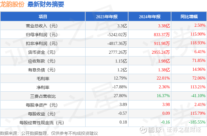 据证券之星公开数据整理,近期龙韵股份(603729)发布2024年年报。截至本报告期末,公司营业总收入3.38亿元,同比上升2.5%,归母净利润833.37万元,同比上升115.9%。按单季度数据看,第四季度营业总收入4309.02万元,同比下降37.9%,第四季度归母净利润569.97万元,同比上升109.95%。本报告期龙韵股份应收账款上升,应收账款同比增幅达71.85%。