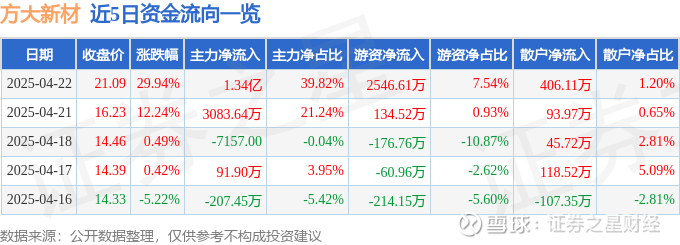 证券之星消息,方大新材4月22日涨停收盘,收盘价21.09元。该股于10点33分涨停,2次打开涨停,截止收盘封单资金为956.22万元,占其流通市值0.74%。
