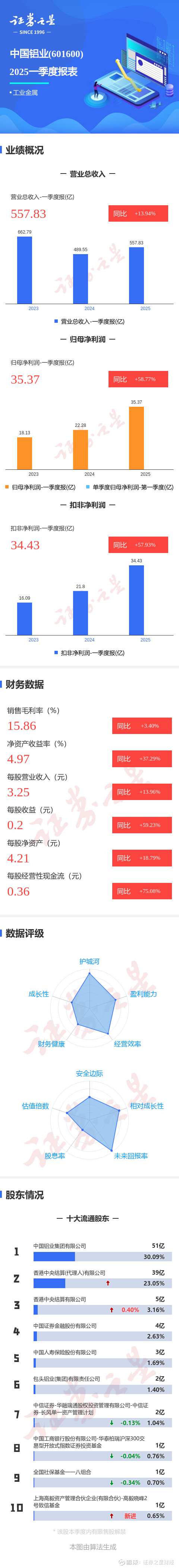 证券之星消息,中国铝业2025年一季报显示,公司主营收入557.84亿元,同比上升13.95%;归母净利润35.38亿元,同比上升58.78%;扣非净利润34.44亿元,同比上升57.94%;负债率47.93%,投资收益4.54亿元,财务费用5.81亿元,毛利率15.86%。