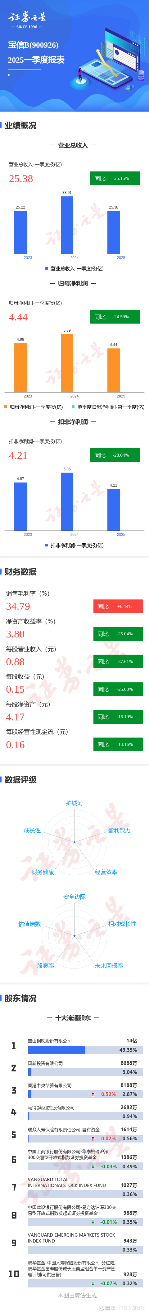 证券之星消息,宝信B2025年一季报显示,公司主营收入25.38亿元,同比下降25.16%;归母净利润4.45亿元,同比下降24.6%;扣非净利润4.22亿元,同比下降28.05%;负债率42.41%,投资收益-43.58万元,财务费用164.96万元,毛利率34.79%。