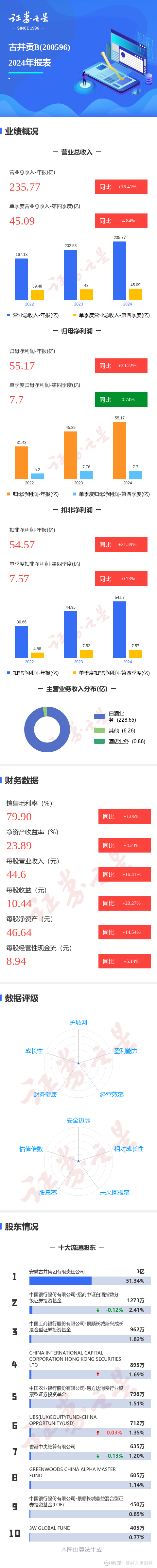 证券之星消息,古井贡B2024年年报显示,公司主营收入235.78亿元,同比上升16.41%;归母净利润55.17亿元,同比上升20.22%;扣非净利润54.57亿元,同比上升21.4%;其中2024年第四季度,公司单季度主营收入45.09亿元,同比上升4.85%;单季度归母净利润7.71亿元,同比下降0.74%;单季度扣非净利润7.58亿元,同比上升0.74%;负债率36.59%,投资收益-3448.75万元,财务费用-3.49亿元,毛利率79.9%。