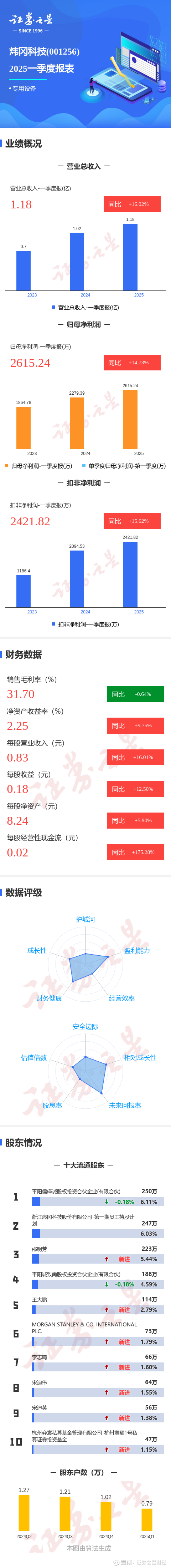 证券之星消息,炜冈科技2025年一季报显示,公司主营收入1.19亿元,同比上升16.02%;归母净利润2615.25万元,同比上升14.73%;扣非净利润2421.82万元,同比上升15.63%;负债率27.44%,投资收益492.82万元,财务费用32.74万元,毛利率31.7%。