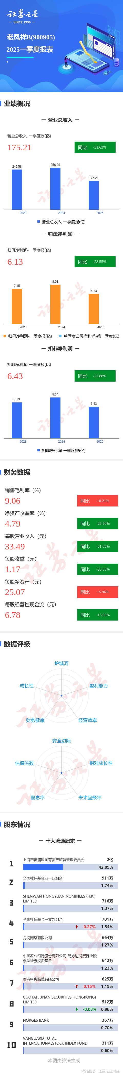 证券之星消息,老凤祥B2025年一季报显示,公司主营收入175.21亿元,同比下降31.64%;归母净利润6.13亿元,同比下降23.55%;扣非净利润6.44亿元,同比下降22.88%;负债率46.85%,投资收益-5389.3万元,财务费用5696.88万元,毛利率9.06%。