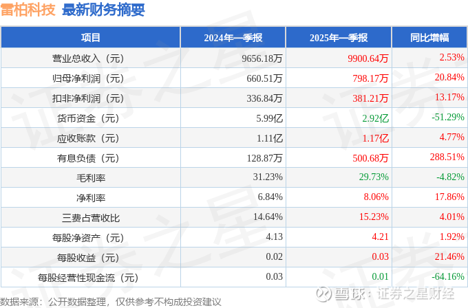 据证券之星公开数据整理,近期雷柏科技(002577)发布2025年一季报。截至本报告期末,公司营业总收入9900.64万元,同比上升2.53%,归母净利润798.17万元,同比上升20.84%。按单季度数据看,第一季度营业总收入9900.64万元,同比上升2.53%,第一季度归母净利润798.17万元,同比上升20.84%。本报告期雷柏科技公司应收账款体量较大,当期应收账款占最新年报归母净利润比达317.22%。
