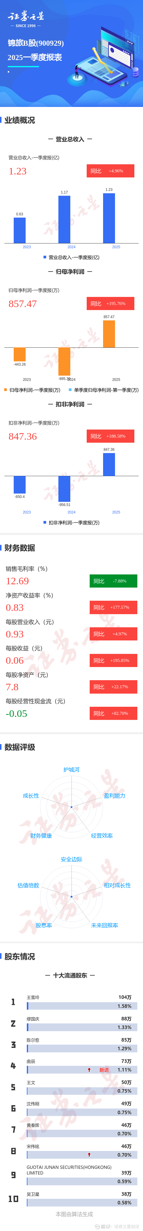 证券之星消息,锦旅B股2025年一季报显示,公司主营收入1.24亿元,同比上升4.97%;归母净利润857.48万元,同比上升195.77%;扣非净利润847.36万元,同比上升188.59%;负债率30.36%,投资收益1984.66万元,财务费用49.78万元,毛利率12.69%。