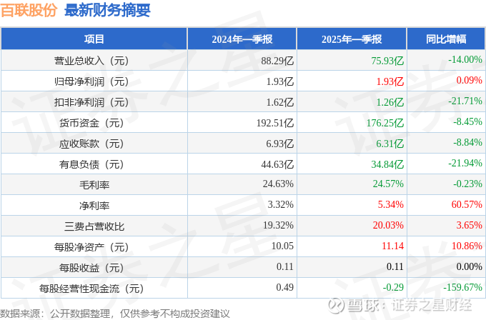 据证券之星公开数据整理,近期百联股份(600827)发布2025年一季报。根据财报显示,百联股份净利润增0.09%。截至本报告期末,公司营业总收入75.93亿元,同比下降14.0%,归母净利润1.93亿元,同比上升0.09%。按单季度数据看,第一季度营业总收入75.93亿元,同比下降14.0%,第一季度归母净利润1.93亿元,同比上升0.09%。