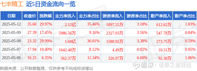 证券之星消息,七丰精工5月12日涨停收盘,收盘价35.6元。该股于9点54分涨停,4次打开涨停,截止收盘封单资金为3606.07万元,占其流通市值1.99%。