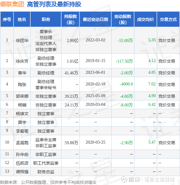 德联集团的高管列表及最新持股情况如下:
