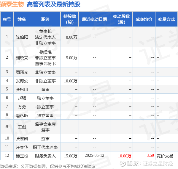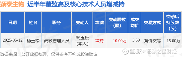 颖泰生物近半年内的董监高及核心技术人员增减持详情如下: