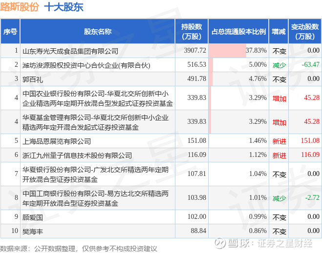 证券之星消息,5月21日路斯股份发布公告《路斯股份:持股5%以上股东减持股份结果公告》,其股东潍坊浚源股权投资中心合伙企业(有限合伙)于2025年3月18日至2025年5月20日间合计减持142.46万股,占公司目前总股本的1.379%,变动期间该股股价上涨67.18%,截止5月20日收盘报31.78元。