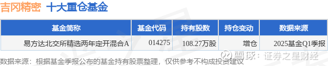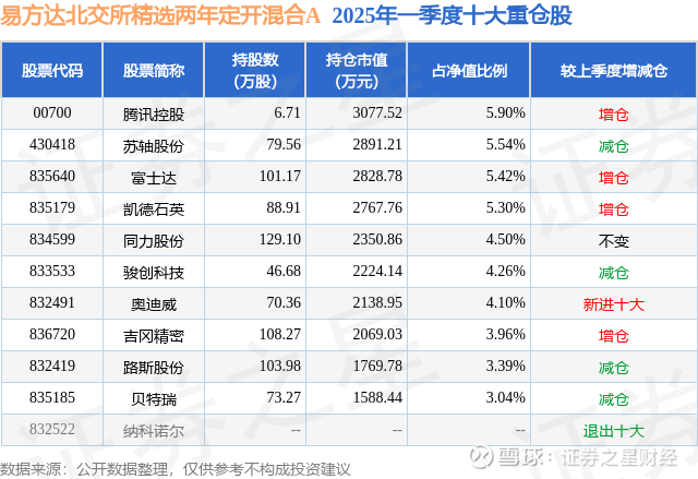 根据2025基金Q1季报公募基金重仓股数据,重仓该股的公募基金共1家,其中持有数量最多的公募基金为易方达基金的易方达北交所精选两年定开混合A。易方达北交所精选两年定开混合A目前规模为4.12亿元,最新净值1.6014(5月21日),较上一交易日下跌0.79%,近一年上涨109.16%。该公募基金现任基金经理为郑希。郑希在任的基金产品包括:易方达信息产业混合A,管理时间为2016年9月27日至今,期间收益率为150.5%;易方达科创板两年定开混合,管理时间为2020年7月28日至今,期间收益率为-0.97%;易方达信息行业精选股票A,管理时间为2020年8月24日至今,期间收益率为-13.81%;