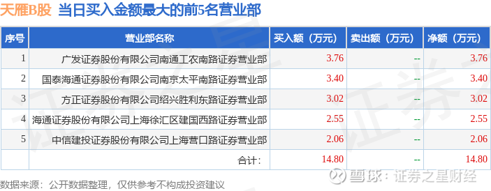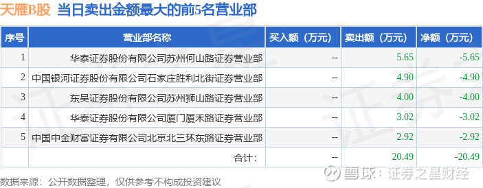 证券之星消息,沪深交易所2025年5月22日公布的交易公开信息显示,天雁B股(900946)因有价格涨跌幅限制的日收盘价格跌幅偏离值达到7%的前五只证券登上龙虎榜。此次是近5个交易日内第2次上榜。