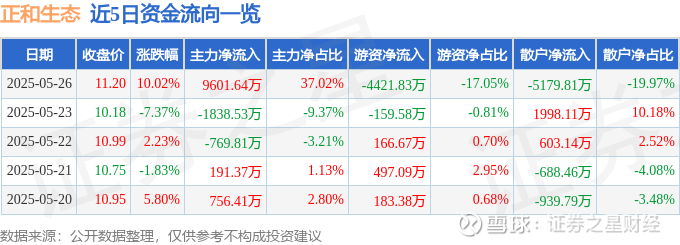 证券之星消息,正和生态5月26日涨停收盘,收盘价11.2元。该股于9点30分涨停,5次打开涨停,截止收盘封单资金为1650.44万元,占其流通市值1.75%。