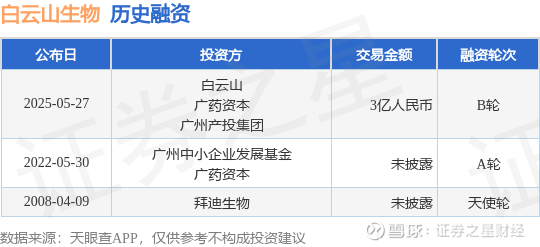 证券之星消息,根据天眼查APP于5月27日公布的信息整理,广州白云山生物制品股份有限公司B轮融资,融资额3亿人民币,参与投资的机构包括白云山,广药资本,广州产投集团。