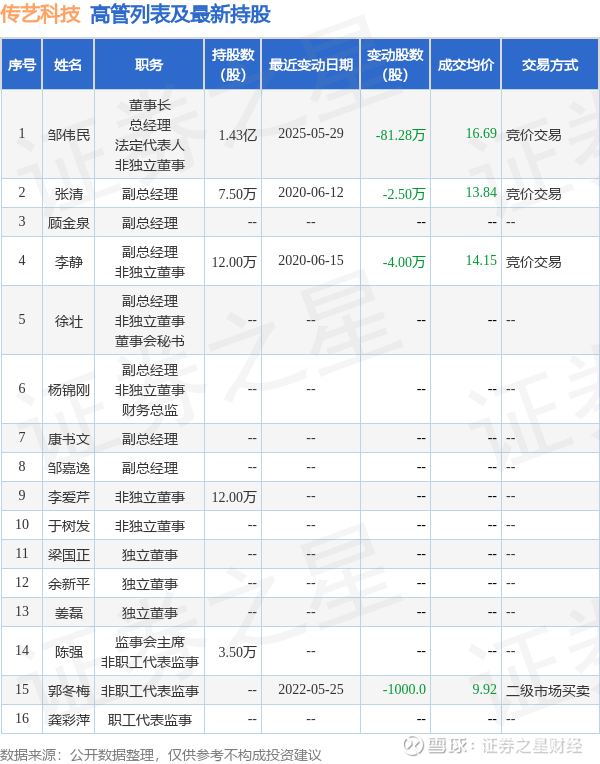 传艺科技的高管列表及最新持股情况如下: