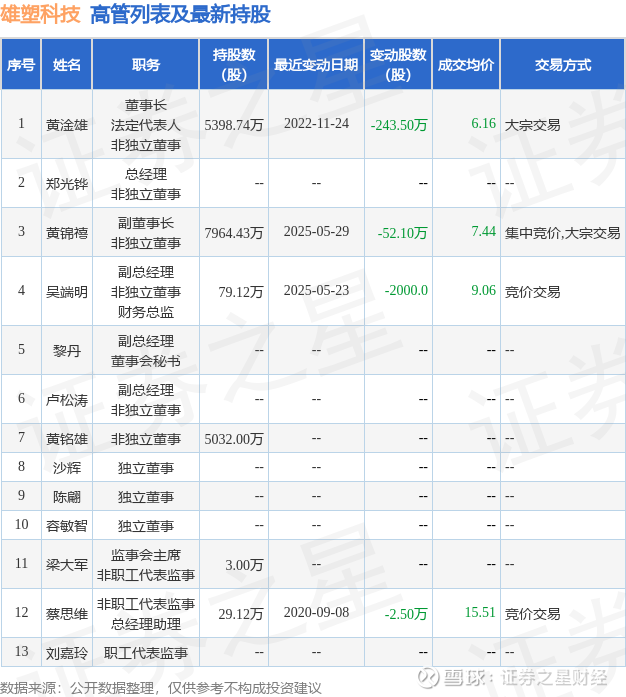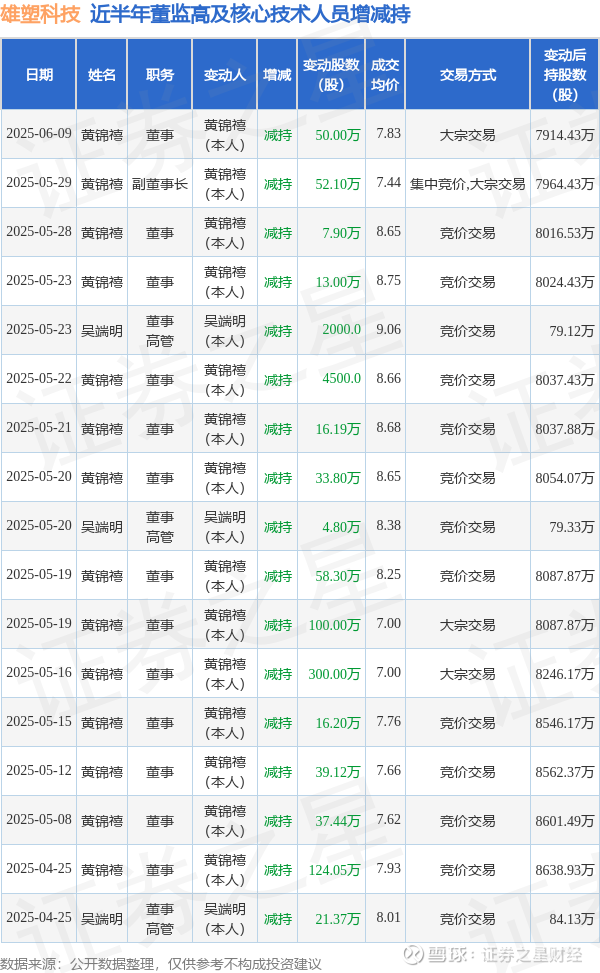 雄塑科技近半年内的董监高及核心技术人员增减持详情如下:
