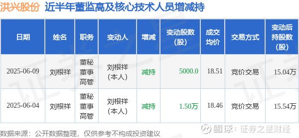 洪兴股份近半年内的董监高及核心技术人员增减持详情如下: