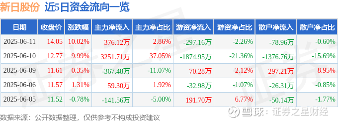 证券之星消息,新日股份6月11日涨停收盘,收盘价14.05元。该股于9点25分涨停,未打开涨停,截止收盘封单资金为8131.72万元,占其流通市值2.51%。