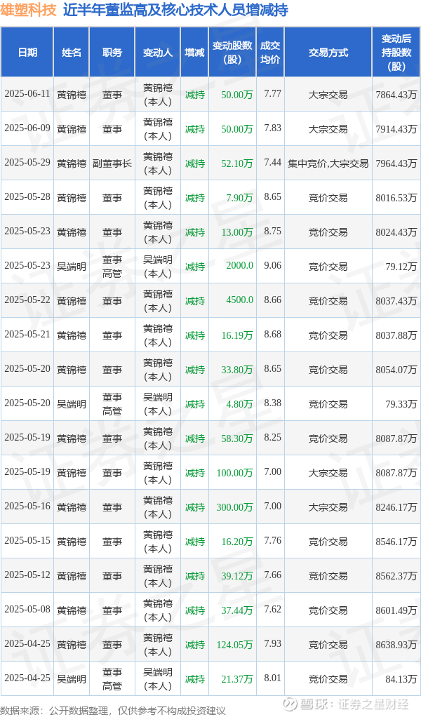 雄塑科技近半年内的董监高及核心技术人员增减持详情如下: