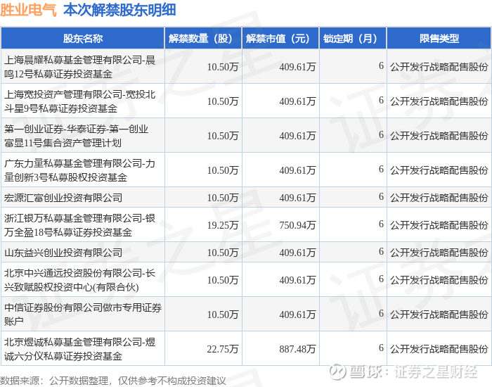 证券之星消息,根据市场公开信息整理,胜业电气(920128)于6月13日将有126.0万股限售股份解禁,为公司公开发行战略配售股份,占公司总股本1.55%。(本次数据根据历史公告整理得出,实际情况以上市公司最新公告为准)最近一年内,该股累计解禁360.0万股,占总股本的4.43%。本次解禁后,公司还有5923.0万股限售股份,占总股本72.95%。具体如下图所示: