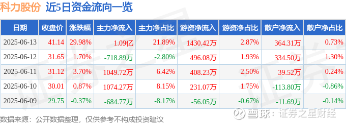 证券之星消息,科力股份6月13日涨停收盘,收盘价41.14元。该股于10点33分涨停,未打开涨停,截止收盘封单资金为5794.91万元,占其流通市值7.06%。