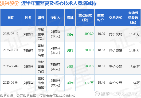 洪兴股份近半年内的董监高及核心技术人员增减持详情如下: