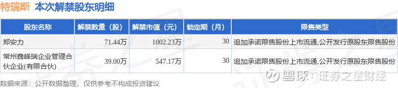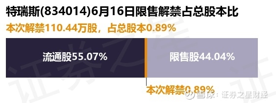 证券之星消息,根据市场公开信息整理,特瑞斯(834014)于6月16日将有110.44万股限售股份解禁,为公司追加承诺限售股份上市流通,公开发行原股东限售股份,占公司总股本0.89%。(本次数据根据历史公告整理得出,实际情况以上市公司最新公告为准)最近一年内,该股累计解禁2351.44万股,占总股本的18.89%。本次解禁后,公司还有5480.94万股限售股份,占总股本44.04%。具体如下图所示: