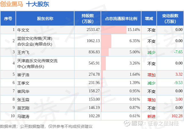 根据创业黑马2025年一季报公布的十大股东详情如下: