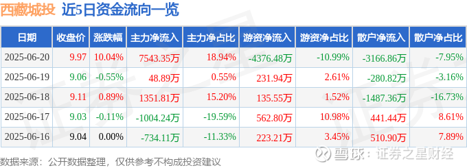 证券之星消息,西藏城投6月20日涨停收盘,收盘价9.97元。该股于14点38分涨停,1次打开涨停,截止收盘封单资金为3122.76万元,占其流通市值0.33%。