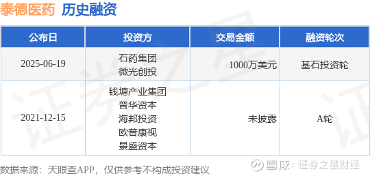 证券之星消息,根据天眼查APP于6月19日公布的信息整理,泰德医药(浙江)股份有限公司基石投资轮融资,融资额1000万美元,参与投资的机构包括石药集团,微光创投。