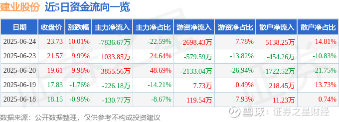 证券之星消息,建业股份6月24日涨停收盘,收盘价23.73元。该股于9点25分涨停,3次打开涨停,截止收盘封单资金为4404.05万元,占其流通市值1.14%。