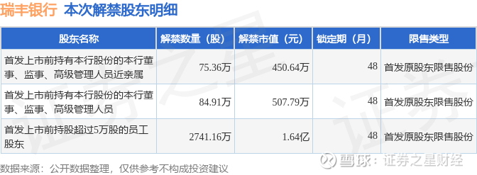 证券之星消息,根据市场公开信息整理,瑞丰银行(601528)于6月25日将有2901.43万股限售股份解禁,为公司首发原股东限售股份,占公司总股本1.48%。(本次数据根据历史公告整理得出,实际情况以上市公司最新公告为准)最近一年内,该股累计解禁9.15亿股,占总股本的46.64%。本次解禁后,公司还有2.28亿股限售股份,占总股本11.6%。具体如下图所示: