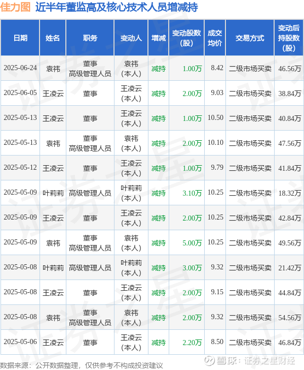 佳力图近半年内的董监高及核心技术人员增减持详情如下: