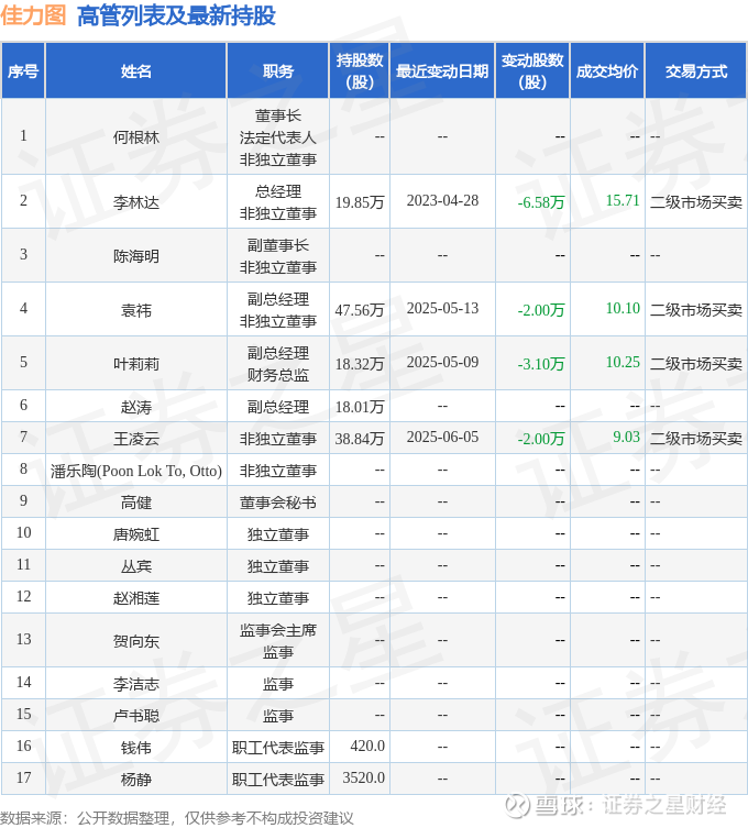 佳力图的高管列表及最新持股情况如下: