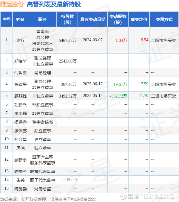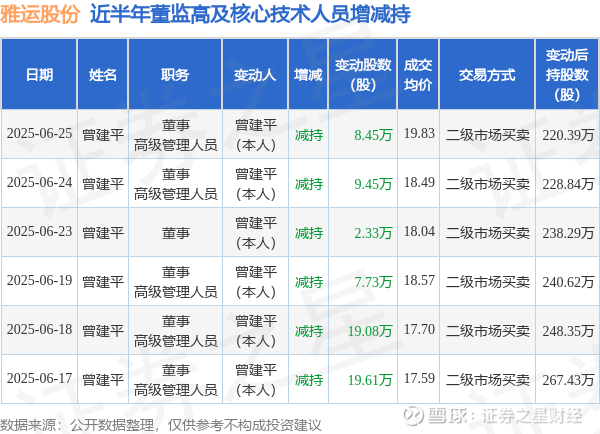 雅运股份近半年内的董监高及核心技术人员增减持详情如下:
