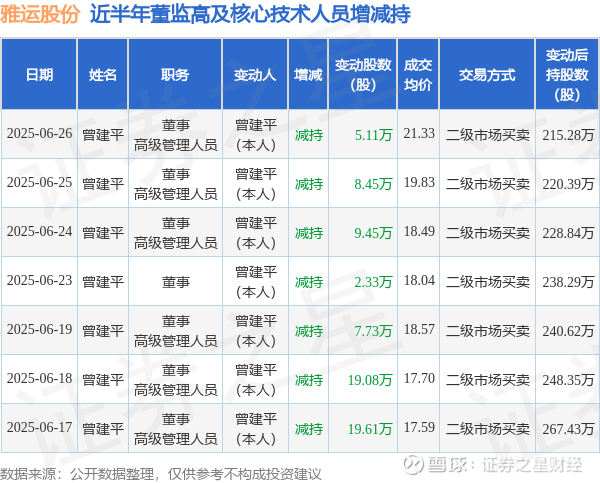 雅运股份近半年内的董监高及核心技术人员增减持详情如下: