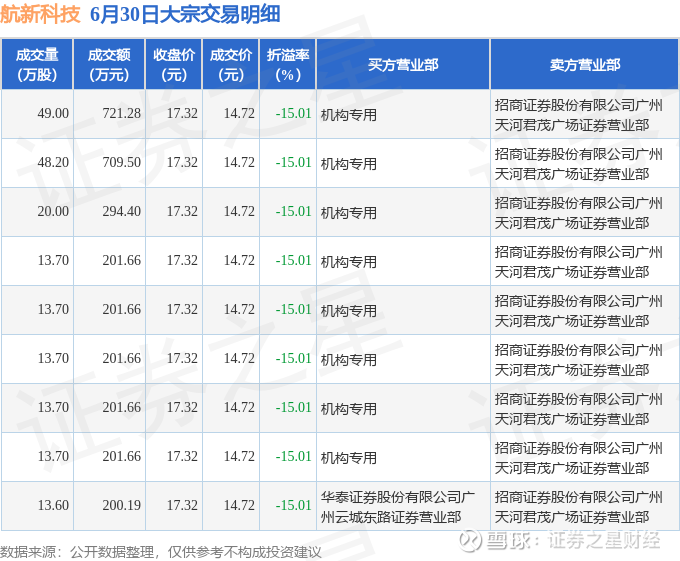 证券之星消息,6月30日航新科技发生大宗交易,交易数据如下: