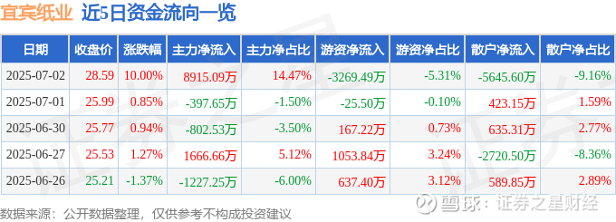 证券之星消息,宜宾纸业7月2日涨停收盘,收盘价28.59元。该股于11点7分涨停,未打开涨停,截止收盘封单资金为5160.78万元,占其流通市值1.02%。