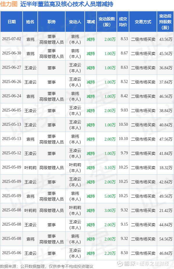 佳力图近半年内的董监高及核心技术人员增减持详情如下: