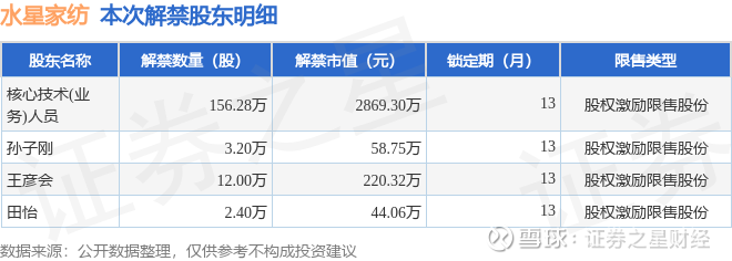 证券之星消息,根据市场公开信息整理,水星家纺(603365)于7月4日将有173.88万股限售股份解禁,为公司股权激励限售股份,占公司总股本0.66%。(本次数据根据历史公告整理得出,实际情况以上市公司最新公告为准)本次解禁后,公司还有287.12万股限售股份,占总股本1.09%。具体如下图所示: