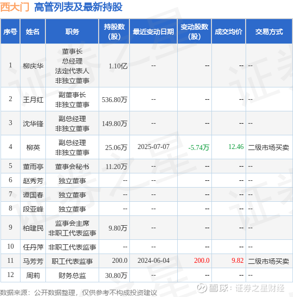 西大门的高管列表及最新持股情况如下: