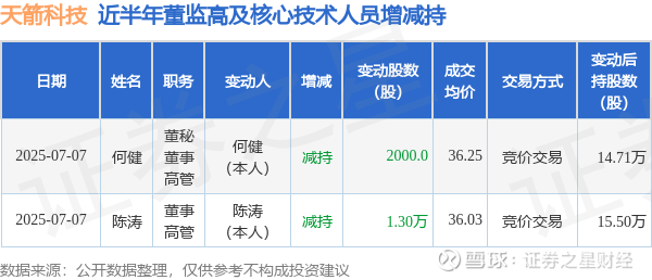 天箭科技近半年内的董监高及核心技术人员增减持详情如下: