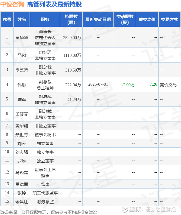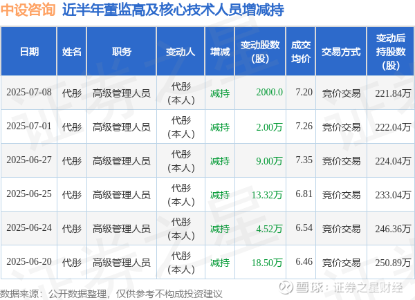 中设咨询近半年内的董监高及核心技术人员增减持详情如下: