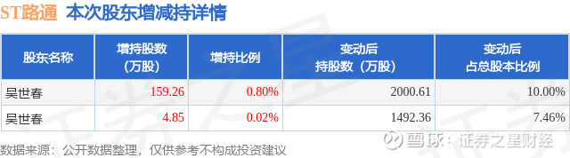 证券之星消息,7月9日ST路通发布公告《ST路通:无锡路通视信网络股份有限公司关于持股5%以上股东持股比例达到10%的权益变动提示性公告》,其股东吴世春于2025年4月28日至2025年7月7日间合计增持164.11万股,占公司目前总股本的0.8206%,变动期间该股股价上涨5.78%,截止7月7日收盘报10.62元。