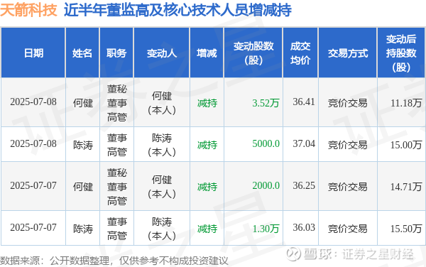 天箭科技近半年内的董监高及核心技术人员增减持详情如下: