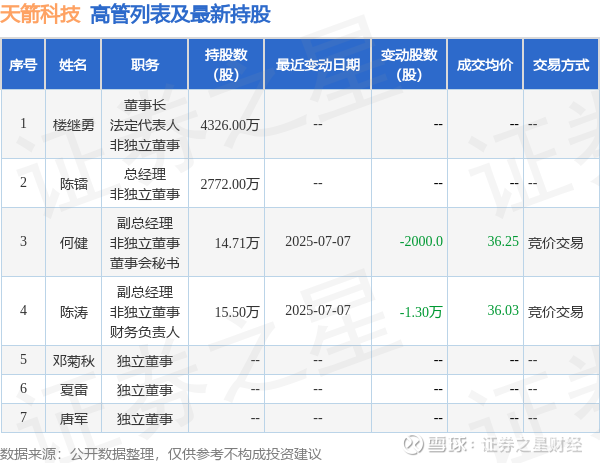 天箭科技的高管列表及最新持股情况如下: